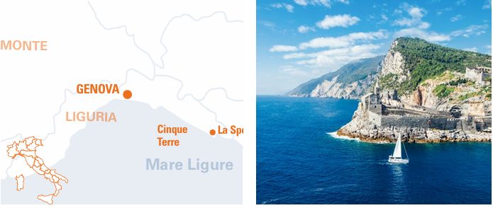 La Spezia > Cinque Terre > La Spezia. As Cinque Terre são uma das zonas com o mar mais limpo do Mediterrâneo e uma das áreas mais ampla na região Liguria. Uma área que preserva a sua essência milenar até os tempos de hoje. Visitar as “Cinque Terre” significa visitar cinco aldeias muito pequenas, enfileiradas uma ao lado da outra, suspensas entre terra e mar, encaixadas em penhascos e rodeadas por verde colinas. Você conhecerá a história de gente que, ao longo dos séculos, têm lutado contra as dificuldades do terreno e da natureza. Uma cultura milenar gravada em suas muralhas de pedra e em seus vinhedos. As Cinque Terre eram apenas vilarejos de pescadores até serem descobertas por turistas e virarem um parque nacional. Os visitantes poderão escolher entre dar um mergulho no mar ou fazer um tour pelas colinas. Entre caminhar pelas ruas estreitas (chamadas “carruggi”) ou andar de barco. As Cinque Terre são um cenário único no mundo, onde o ser humano e a natureza vivem em harmonia desde os tempos antigos.